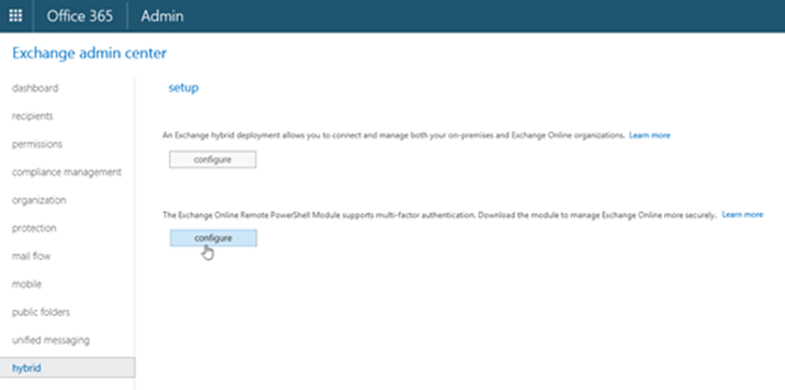 hybride > et cliquez sur le bouton configurer pour télécharger le module Exchange Online Remote PowerShell pour l’authentification multi facteur.