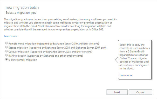 Pour plus d’information : https://docs.microsoft.com/en-us/Exchange/mailbox-migration/perform-g-suite-migration
