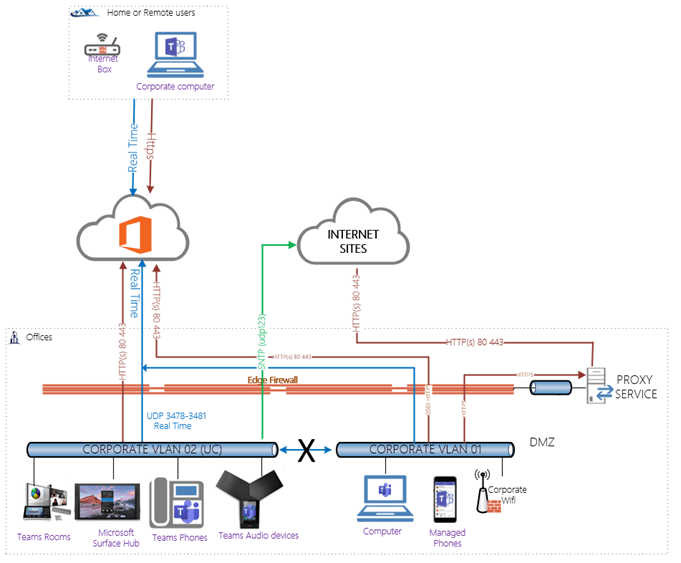 Direct connection refers to connecting audio devices to a particular VLAN that will not require the audio-video devices to declare a proxy service. HTTPS Streams are therefore addressed directly to Microsoft Teams service points and UDP (real-time) streams are sent and forwarded directly from the device’s Teams client to Microsoft service points.