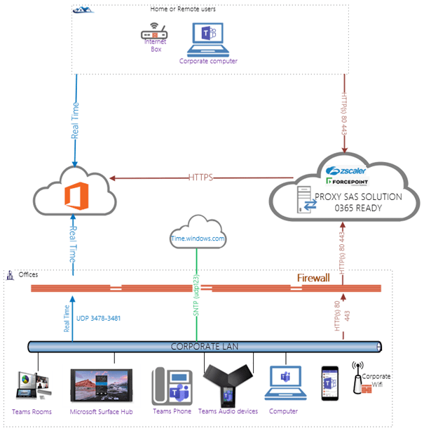 Connecting via a proxy service consists of declaring an authenticated (or non-authenticated) proxy service within the audio and video devices to be able to output HTTPS streams. UDP streams (UDP 3478-3481) exit through the default gateway of the network devices.