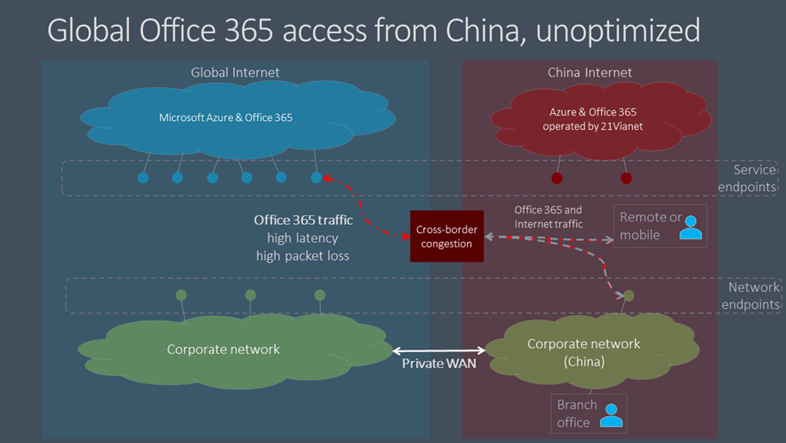 Pour les entreprises ayant des Tenant Office 365 dans le monde entier et une présence en Chine, les performances des clients d’Office 365 pour les utilisateurs basés en Chine peuvent être compliquées par des facteurs propres à l’architecture Internet de China Telco.