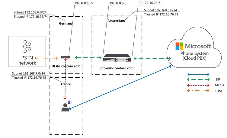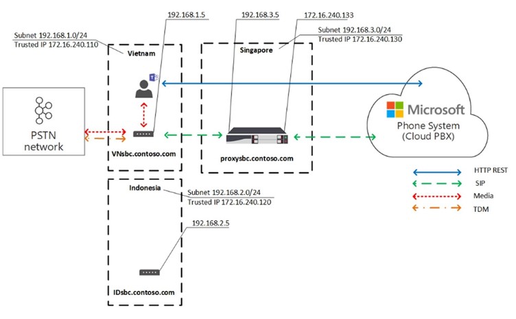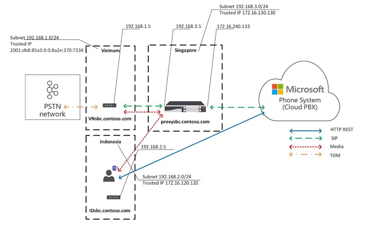 Sur la photo ci-dessous, le SBC au Vietnam ne peut pas avoir d’IP publique pour une interaction directe avec l’interface de routage direct de Microsoft. Mais le SBC de Singapour (qui est également disponible via un réseau interne au SBC du Vietnam) peut le faire.