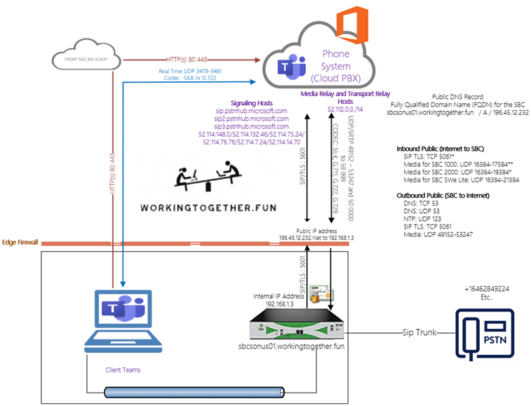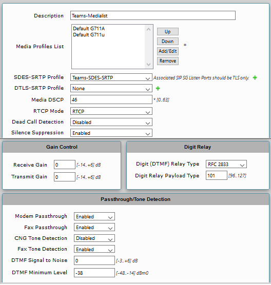 - La passerelle sbcsonus01.workingtogether.fun possède une entrée dans la liste des médias précisant pour Microsoft Teams le type de Codec utilisé ainsi que son paramétrage.