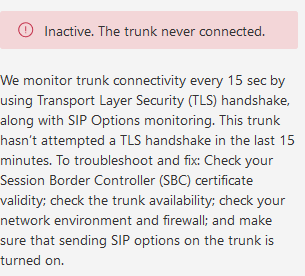 Seulement après quelques heures nous constatons dans l’interface Teams que la passerelle est toujours down alors que notre firewall indique qu’aucun paquet provenant des sources MS vers la passerelle n’a été rejeté et inversement