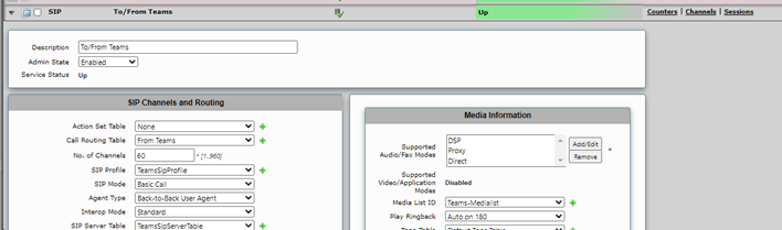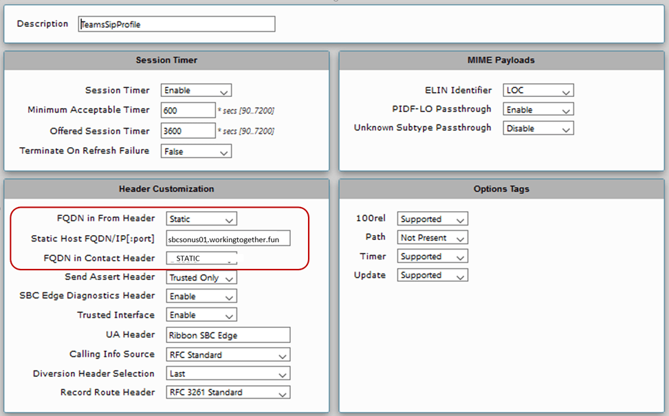 Pour Teams, le groupe de signalisation faisant face au serveur Teams doit être configuré comme « FQDN SBC Edge » ou « Statique » (s’il y a plus d’un groupe de signalisation connecté au routage direct des équipes). Le FQDN dans l’en-tête de contact doit être le même FQDN que celui utilisé dans la passerelle en ligne pour le tenant d’Office 365. Si l’adresse IP du SBC est configurée dans l’en-tête de contact au lieu du FQDN du SBC, un message interdit est reçu.