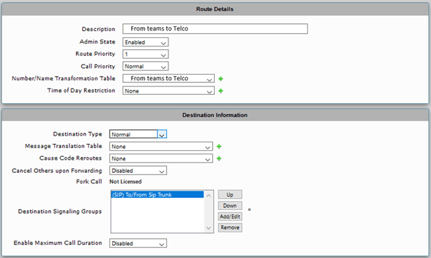 Configuration de la table d’appel de routage sur la passerelle sbcsonus01.workingtogether.fun