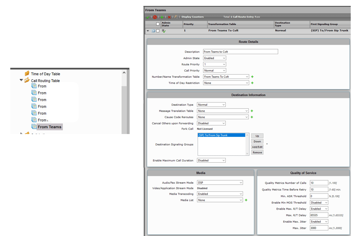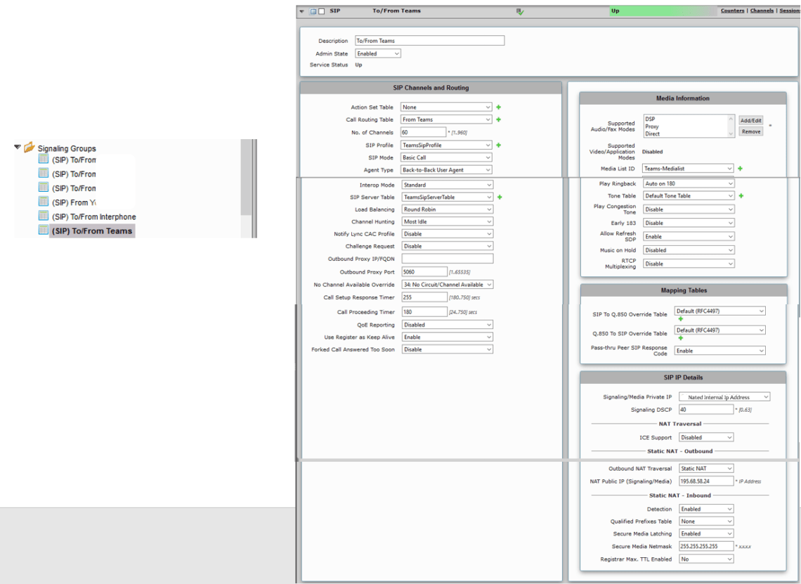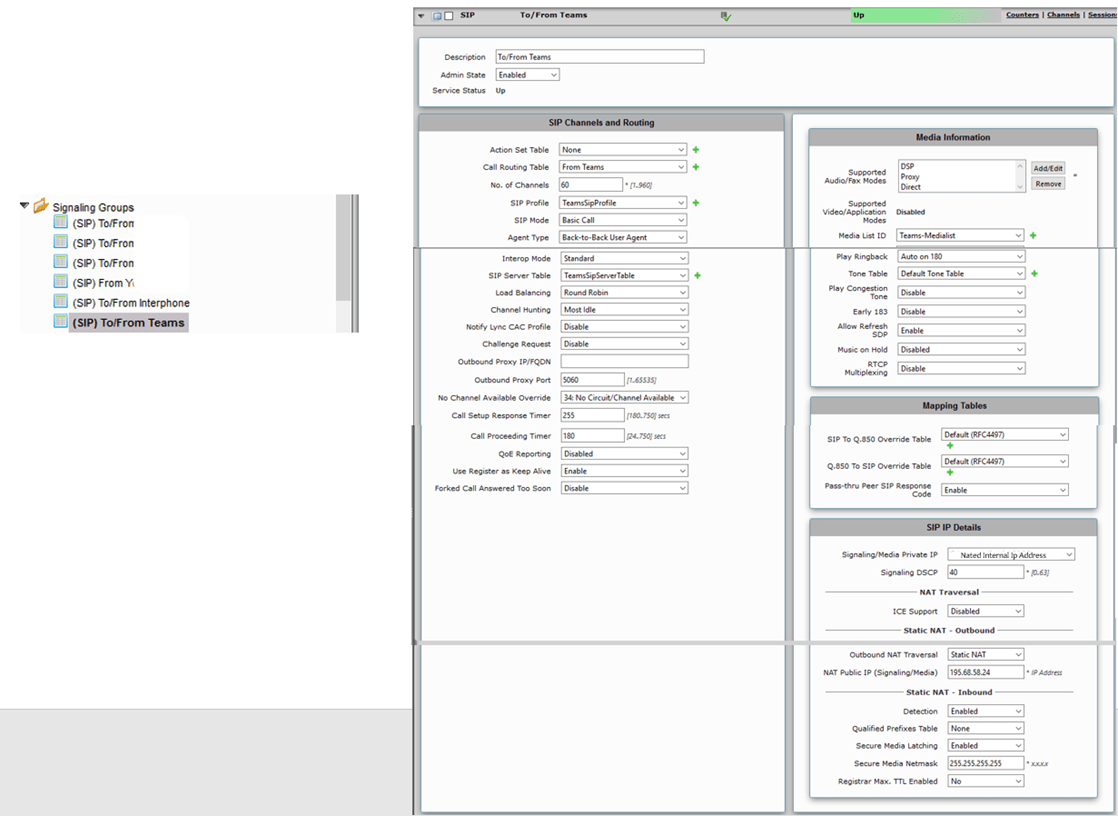 The signaling group is one of the most important parts in the configuration. Go to the Signaling group menu and create a signaling group « To/From Teams » with the values below
