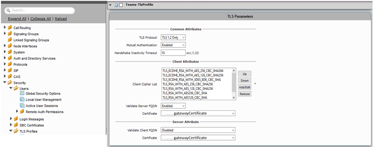 Comme il peut exister plusieurs profils TLS en fonction de la passerelle je vous conseille de préfixer le nom de votre profil du Terme «Teams- ». La figure suivante illustre la configuration que vous devez mettre en place pour créer ce Profil TLS