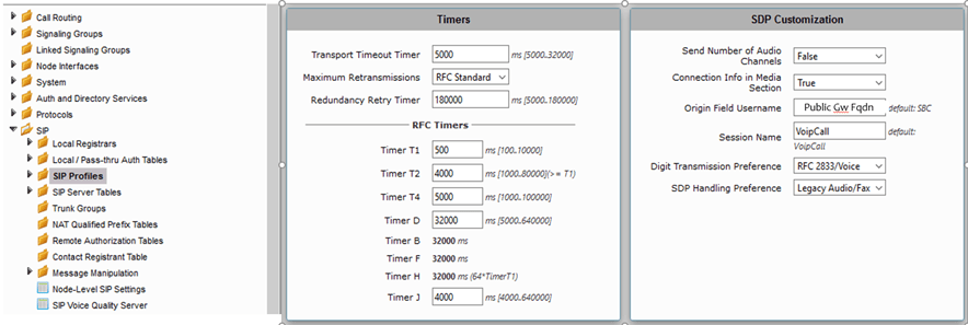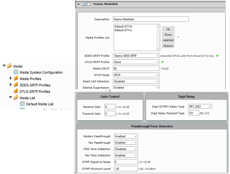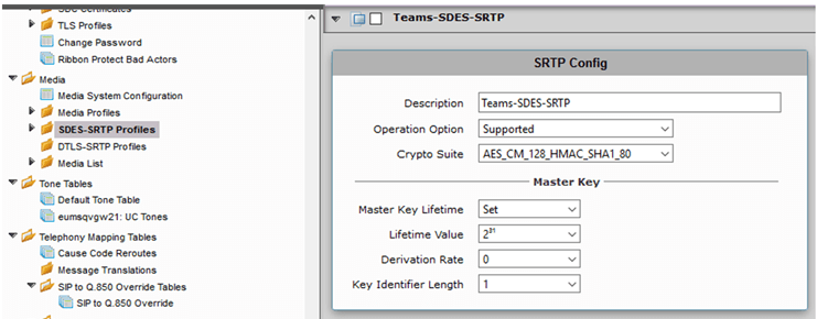 Media streams will be encrypted between the gateway and Microsoft services. The following section describes the encryption modality between the two parties. Go to the SDES-SRTP Profiles menu and create an encryption profile for Real Time Streams (RTP)