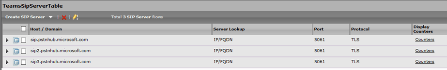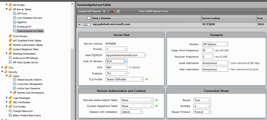 In this configuration the gateway needs to know the SIP servers it will need to communicate with. To do this we create a table of Sip servers that will describe the connection points of the Microsoft service for signaling.