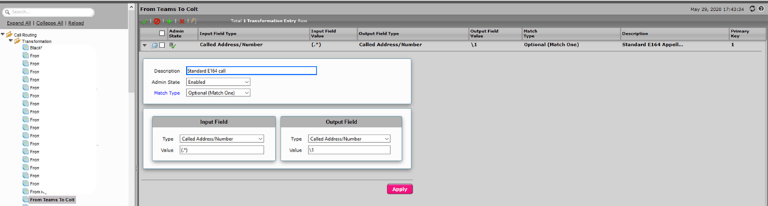 La table de transformation des numéros permet de décrire comment les numéros de téléphone provenant de Teams et donc composés par les utilisateurs vont devoir être transformés (ou pas) pour être acceptés par la passerelle et par l’opérateur. Normalement, les règles de normalisation de numéro que vous allez devoir créer sur Teams devraient faire en sorte que vous n’ayez pas trop de chose à faire ici sauf changer par exemple le numéro de la personne appelante par exemple. Comme cette partie dépend de ce que vous voulez faire nous avons créé une table simplissime qui prend le numéro composé et ne le change pas. Dans un premier temps faites cela. De toutes les façons vous devriez revenir sur ces configurations plus tard. Ici nous nommons la table comme ceci From Teams to lenomdel’operateur connecté derrière la passerelle.