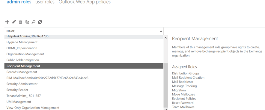 Dans ce groupe de rôle se trouve les rôles Distribution Groups, Mail Recipient Creation, Mail recipients, Message tracking, Migration, Move Mailboxes,Recipient Policies, reset Password, Team Mailboxes