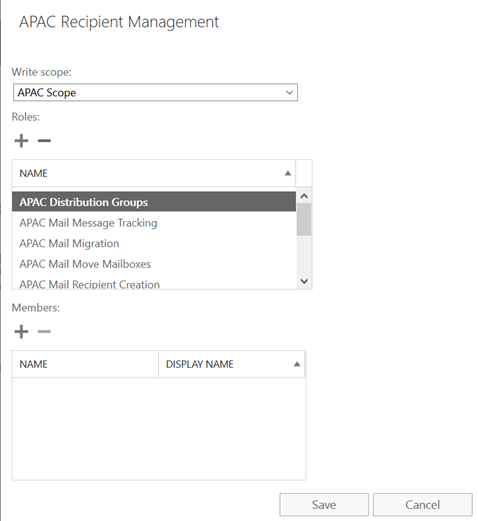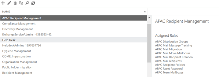 - New-RoleGroup -Name « APAC Recipient Management » -Role « APAC Distribution Groups », »APAC Mail Recipient Creation », »APAC Mail recipients », »APAC Mail Message Tracking », »APAC Mail Migration », »APAC Mail Move Mailboxes », »APAC Recipient Policies », »APAC Reset Password », »APAC Team Mailboxes » –CustomRecipientWriteScope « APAC Scope »