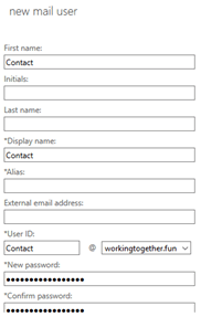 - Vous devrez créer un Mail user dans l’environnement Microsoft Exchange Online auquel vous associerez l’adresse contact@workingtogheter.fun puis l’adresse de destination à savoir contact@customerservices.fun. Vous positionnerez ensuite l’adresse externe avec contact@customerservices.fun