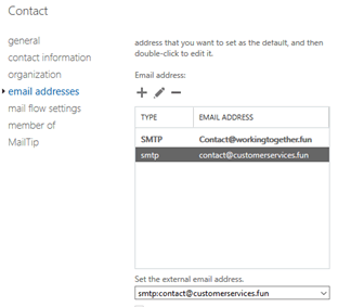 To do so, you will have to create a Mail user in the Microsoft Exchange Online environment to which you will associate the address contact@workingtogheter.fun and then the destination address contact@customerservices.fun.