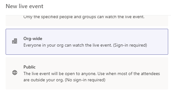 Pourtant le compte que j’utilise ne peut pas faire de live event de type public . J’ai donc utilisé un autre compte qui lui a le droit de planifier un Live Event en mode public et je constate également le même problème. Même si l’option Public n’est pas sélectionnée