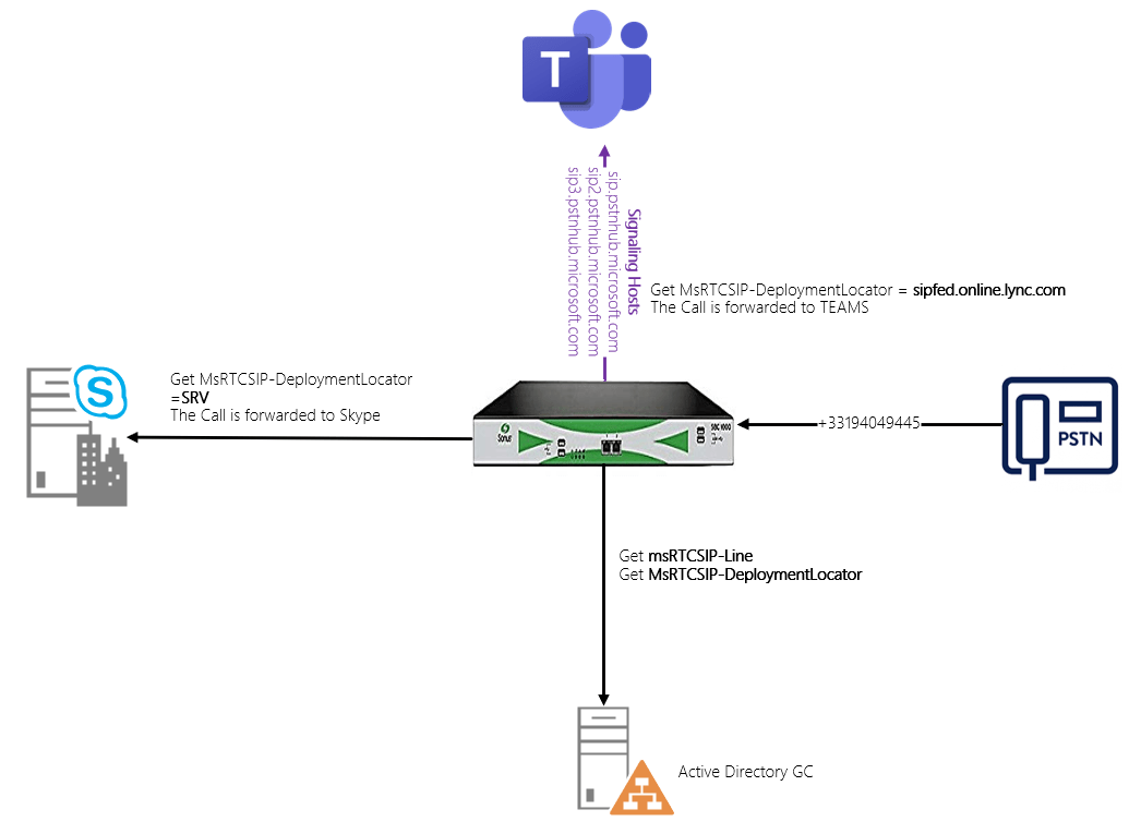 Si la valeur de l’attribut « MsRTCSIP-DeploymentLocator » est égale à sipfed.online. lync.com, l’utilisateur est alors migré vers Teams et la passerelle devra acheminer l’appel vers Teams.