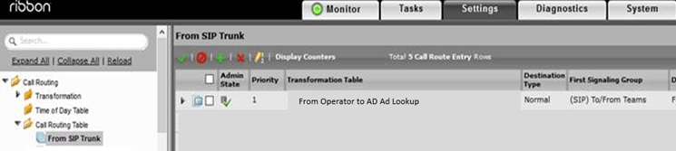 Dans notre exemple, la passerelle Sonus envoie et reçoit des appels vers et depuis un opérateur via un Trunk Sip. Les numéros appelés qui partent ou reviennent vers cette passerelle sont au format E164. (+xxxxx). Cette passerelle est connectée à Microsoft Teams via le principe du Direct Routing et utilise l’annuaire Active Directory local pour interroger et prendre des décisions de routage.