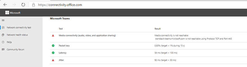 We run the Connectivity.Office.com test and get this result