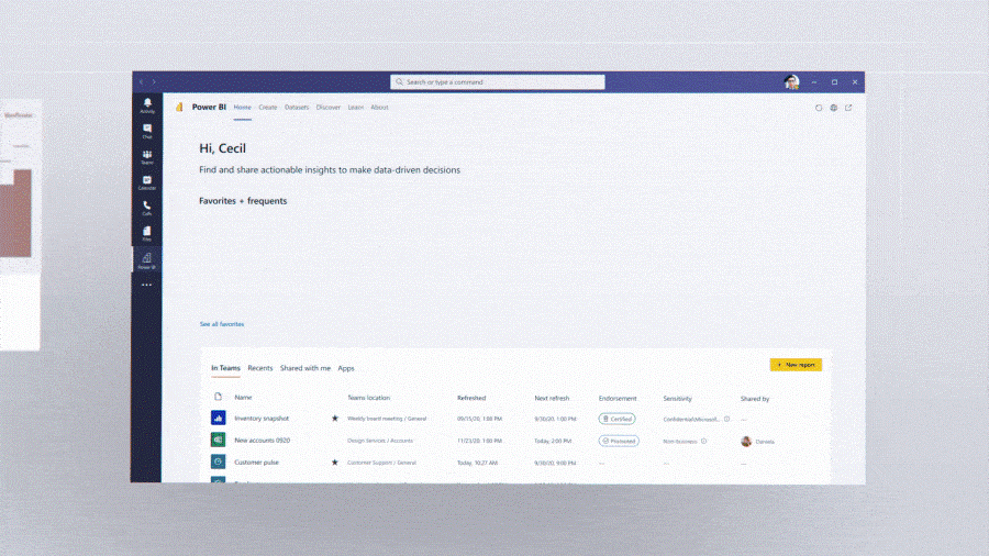 Les améliorations apportées à l’application Power BI pour les équipes, qui seront présentées en avant-première au public plus tard cette année, permettront de découvrir plus facilement les données de l’ensemble de l’organisation et de créer rapidement des visualisations à partir d’ensembles de données Excel au sein même des équipes, de collaborer plus efficacement et de prendre des décisions basées sur une vision en temps réel. Il crée un lieu centralisé où les utilisateurs peuvent trouver et analyser des données, tout en améliorant l’utilisation d’Excel et des équipes grâce à des canaux intégrés, des discussions et des réunions.