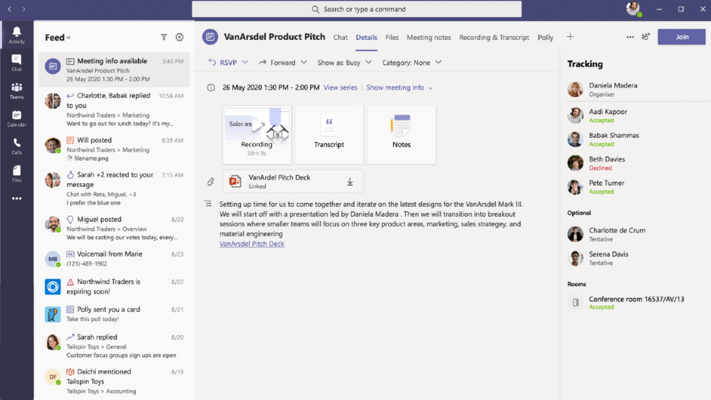 Les récapitulatifs des réunions aident les équipes à rester sur la bonne voie et à faire avancer le travail après une réunion, tant pour les participants que pour ceux qui n’ont pas pu assister à une réunion. Cette année, un récapitulatif comprenant l’enregistrement de la réunion, la transcription, le chat, les fichiers partagés et autres sera automatiquement partagé dans l’onglet Chat de la réunion et consultable dans l’onglet Détails pour chaque réunion. Le récapitulatif sera également disponible dans l’événement de la réunion dans votre calendrier Outlook.