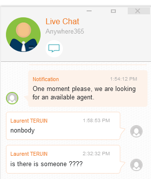 Je tente ma chance sur le Live chat sur le site Anywhere365 et là je démarre le live chat a 1 h 54 et a 2 :32 toujours personne.