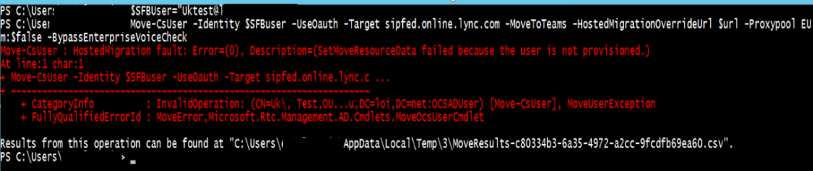 Move-CsUser -Identity $SFBuser -UseOauth -Target sipfed.online.lync.com -MoveToTeams -HostedMigrationOverrideUrl $url -Proxypool Frontend.contoso.local -DomainController DCFQDN -BypassAudioConferencingCheck -Confirm:$false -BypassEnterpriseVoiceCheck