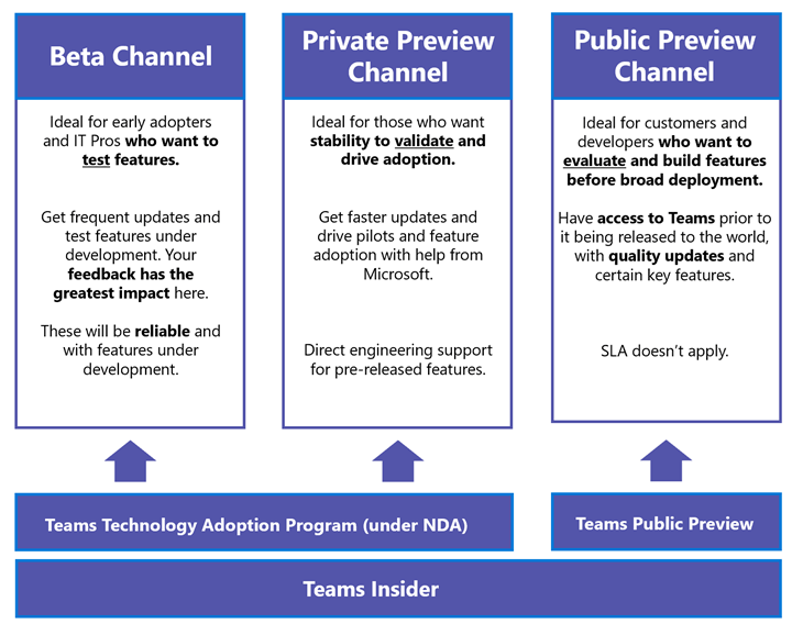 Les initiés de ce canal verront des fonctionnalités plus stables pour la validation et l’adoption pilote. Les mises à jour seront plus rapides et l’aide à l’adoption sera fournie par Microsoft. Le support des fonctionnalités de pré-version est fourni directement par les équipes d’ingénierie. Ce canal était auparavant appelé Ring 3 et, comme le canal Beta, il est disponible pour les clients participants de Teams TAP uniquement dans le cadre de la NDA et des exigences du programme.