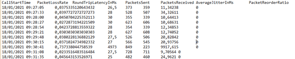 - Temps nécessaire en Milliseconde pour effectuer un aller-retour entre la station et le service Skype online (RoundTripLatencyInMs)
