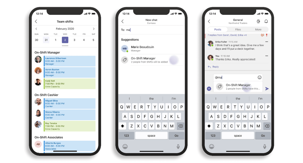 Le marquage par décalage vous permet de vous connecter plus rapidement aux bonnes personnes. Le marquage par équipe vous permet de ne pas avoir à deviner le nom des employés en poste et attribue automatiquement aux utilisateurs des étiquettes correspondant à leur emploi du temps dans l’application Shifts in Teams, soutenue par les principaux systèmes de gestion du personnel comme AMiON, BlueYonder et Kronos. Utilisez cette balise @mention pour lancer un chat ou un appel, ou simplement pour avertir tout le monde sur un canal. Pour en savoir plus, cliquez ici.