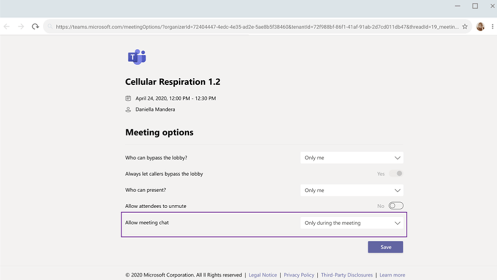 *Les organisateurs de réunions et les enseignants peuvent désormais choisir parmi trois paramètres de chat pour contribuer à créer un environnement de réunion sûr et inclusif. Les chats peuvent être « désactivés », ce qui empêche l’organisateur et les participants d’utiliser le chat de la réunion. Ils peuvent aussi être réglés sur « Seulement pendant la réunion », ce qui permet aux participants d’envoyer des messages seulement pendant la réunion et à l’organisateur d’envoyer des messages à tout moment. Enfin, la valeur par défaut sera « Activé », ce qui permettra d’utiliser le chat pour toutes les plateformes de réunion à tout moment.