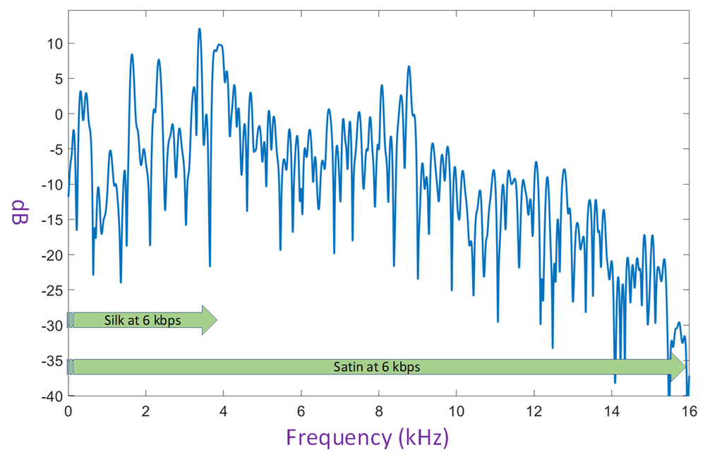 Satin redéfinit la super large bande pour couvrir des fréquences allant jusqu’à 16 kHz (échantillonnées à 32 kHz) pour une plus grande clarté et une meilleure sibilance, et sa compression efficace permet de capturer la voix en super large bande à 6 kbps.