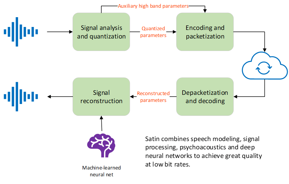 Pour obtenir une qualité super large bande à 6 kbps, Satin utilise une connaissance approfondie de la production de la parole, de la modélisation et de la psychoacoustique pour extraire et coder une représentation clairsemée du signal. Pour réduire davantage le débit binaire requis, Satin ne code et ne transmet que certains paramètres dans les bandes de fréquences inférieures. Au niveau du décodeur, Satin utilise des réseaux neuronaux profonds pour estimer les paramètres de la bande haute à partir des paramètres de la bande basse reçus, et une quantité minimale d’informations secondaires envoyées sur le fil.