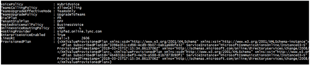 Vérifiez bien que les valeurs sont correctes dans les champs suivants : VoicePolicy, TeamsCallingPolicy,TeamsUpgradeEffectiveMode ,TeamsUpgradePolicy,DialPlan,TenantDialPlan,HostedVoicemailPolicy,OnlineVoiceRoutingPolicy,HostingProvider,EnterpriseVoiceEnabled,LineURI,provisionedplan