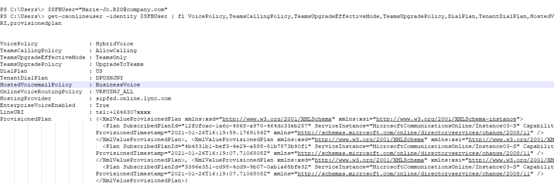 Et pour finir …. On retrouve son ancien LineUri que nous avons changé avant de migrer l’utilisateur. Autant vous dire que cette personne ne peut pas recevoir d’appel.