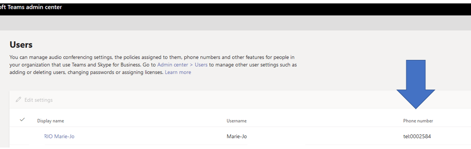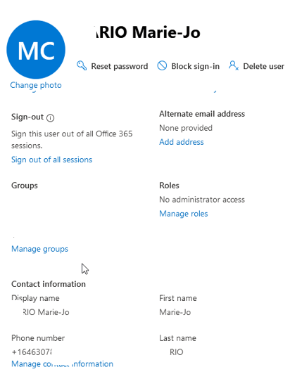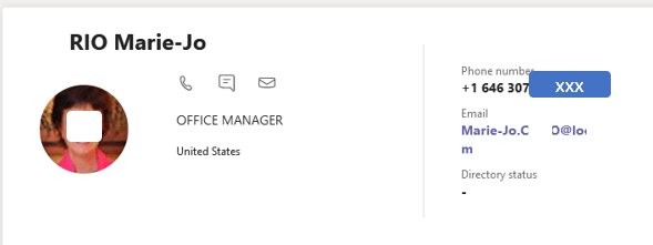 L’utilisateur migré de Skype On Premise Enterprise voice vers Teams phone possédait à l’origine un numéro de téléphone interne tel:0002584 que nous convertissons au format E164 avant de le migrer vers Teams, son numéro de téléphone ou plutôt son LineUri afin qu’il représente son numéro de ligne directe. Soit +1646307xxxx