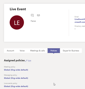This user has a Meeting Policy that match with the Live Event Requirement (see below)