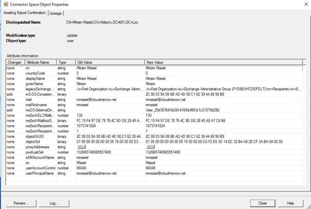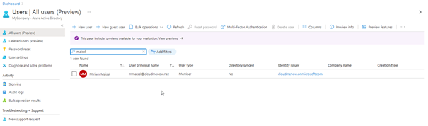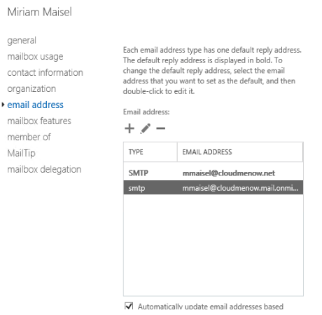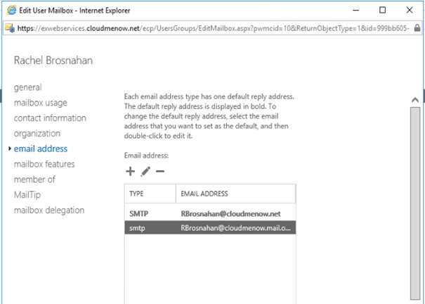 Note the presence of the proxy address cloudmenow.mail.onmicrosoft due to hybridization.