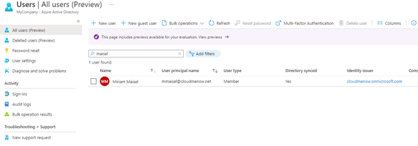 Miriam Maisel’s onprem mailbox is represented by a mailuser in Exchange Online which is quite correct