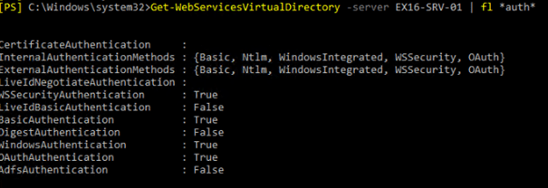 1.13 Get-WebserviceVirtualDirectory -server EX1-SRv-01 | fl *auth* [OK] 10