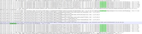 2021-06-25 13:31:11 10.10.10.22 POST /autodiscover/autodiscover.svc &CorrelationID=<empty>;&cafeReqId=5164f6da-87fd-4dd6-9762-690d84dfdf3d; 443 00000002-0000-0ff1-ce00-000000000000 40.101.49.141 ASAutoDiscover/CrossForest/EmailDomain//15.20.4219.029/Freebusy – 200 0 0 3075