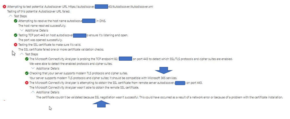 After verification, this public certificate is a wildcard certificate in SHA256. After checking with Microsoft Support, this error message appears because we have disabled TLS 1.0. Fortunately, this is a Microsoft recommendation, I think? TLS 1.0 is a real sieve 😉. This is not going to help us in our diagnosis ☹