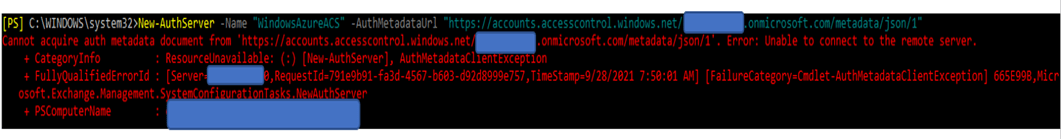 Thanks to the intervention of the security teams managing the firewalls and proxies, we were able to highlight that this specific command (new-authserver) was trying to access the Internet directly and was ignoring the proxy configuration. So we will have to make an exception for these internal mailbox servers so that they can access the Internet directly with TCP. Why this specific command does not use the proxy configuration is a mystery