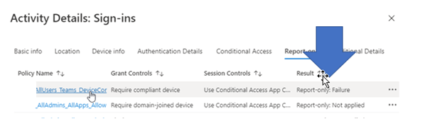 Le but de la manipulation est de restreindre l’accès à l’application Microsoft Teams depuis les postes de travail Windows 10 11 via l’accès conditionnel Azure AD. Pour ce faire, une politique d’accès conditionnel pour l’application Microsoft Teams et pour un groupe d’utilisateurs a été mise en place. Cette politique a été définie sur le rapport uniquement et accorde l’accès à l’application si le poste de travail est enregistré comme un poste de travail hybride Azure AD Join ou si l’application reçoit une politique d’application. Le client doit pouvoir utiliser Chrome , ou Edge ou le bureau Windows Teams. Lorsque nous regardons les journaux de connexion pour un poste de travail HADJ, nous pouvons voir que cette condition n’est pas respectée et que si nous activons cette politique, certains utilisateurs n’auront pas accès à l’application.
