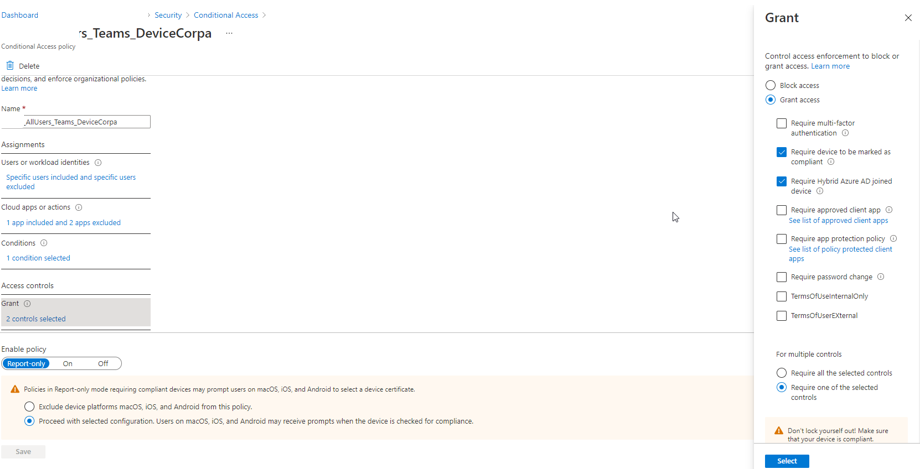 The purpose of the manipulation is to restrict access to the Microsoft Teams application from Windows 10 11 workstations via Azure AD conditional access. To achieve this, a Conditional Access Policy for the Microsoft Teams application and for a user group has been set up. This policy was set to report only and grants access to the application if the workstation is registered as an Azure AD Join Hybrid Workstation or if the application receives an application policy. The client should be able to use Chrome , or Edge or the Windows Teams DesktopWhen we look at the connection logs for an HADJ workstation, we can see that this condition is not respected and that if we activate this Policy some users will not have access to the application.