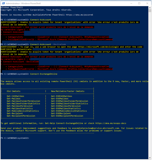 Connect-AZccount voilà une commande let qui ne sait pas gérer les proxys. Et s’il vous faut une preuve la voici. Depuis le même poste de travail connecté sur internet à travers un proxy. La commande Connect-AZaccount ne fonctionne pas, la commande Connect-ExchangeOnline elle fonctionne. Et en powershell 7 en mode admin ou pas c’est la même chose. Même problème