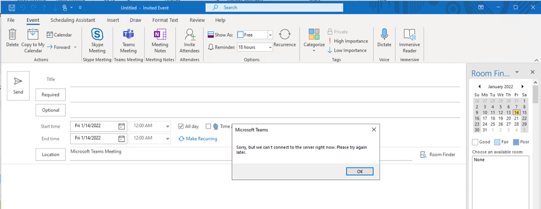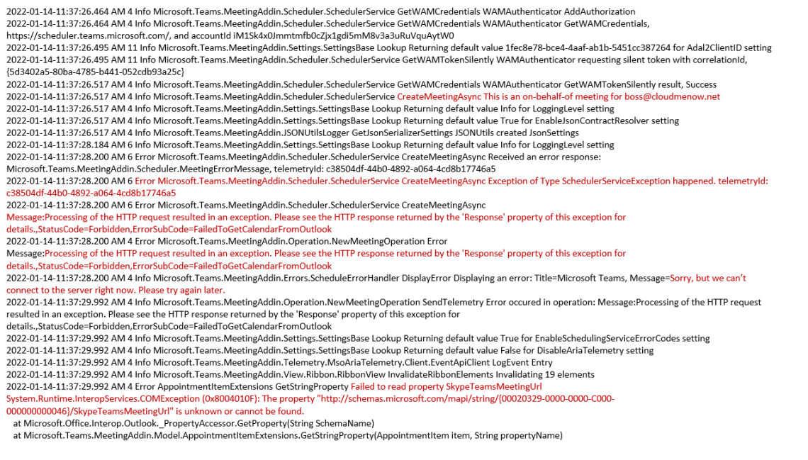- 2022-01-14-11:37:24.347 AM 4 Error AppointmentItemExtensions GetStringProperty Failed to read property SkypeTeamsMeetingUrl