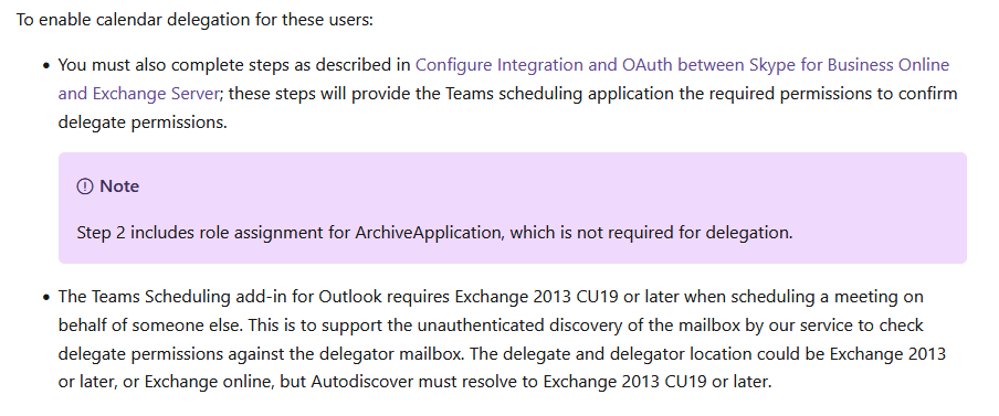 To enable calendar delegation for these users: You must also complete steps as described in Configure Integration and OAuth between Skype for Business Online and Exchange Server; these steps will provide the Teams scheduling application the required permissions to confirm delegate permissions.