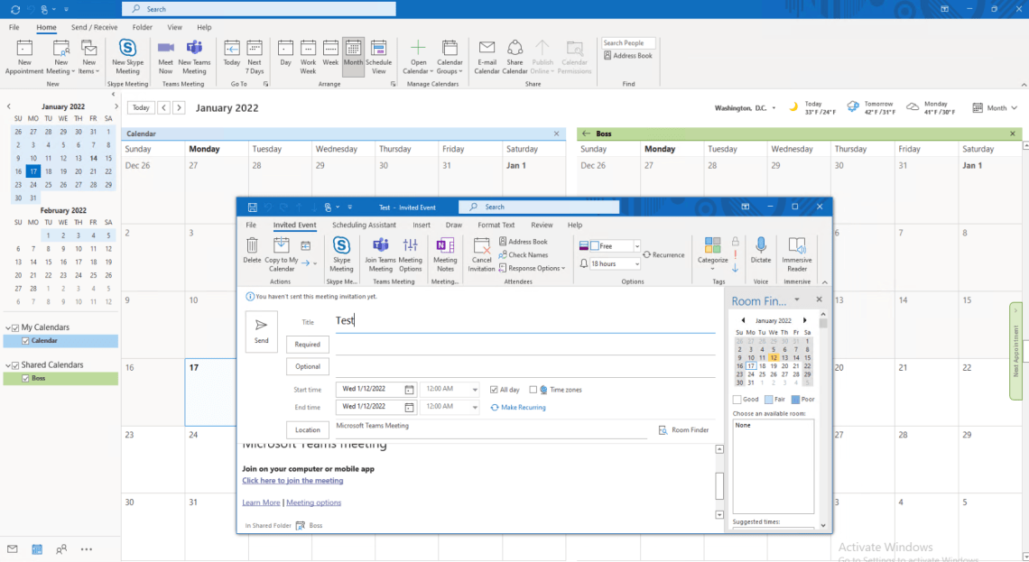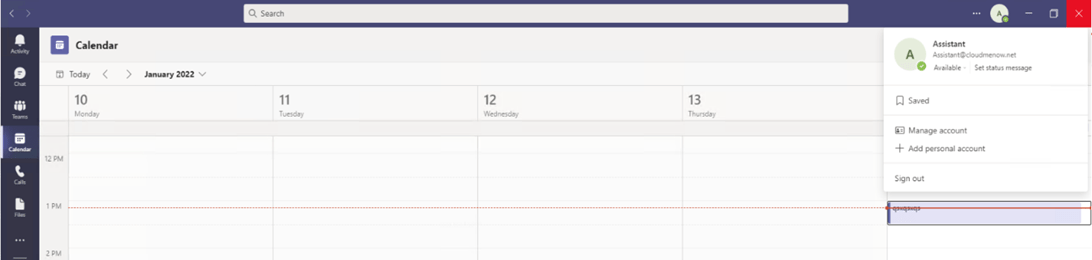 Naturellement j’ai pris soin de vérifier avant que le boss et l’assistant à travers leurs clients teams avaient bien accès à leur calendrier. / Of course I took care to check beforehand that the boss and the assistant through their client teams had access to their calendar.