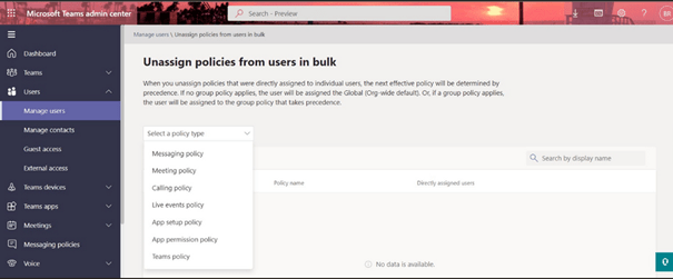 Les administrateurs peuvent nettoyer en vrac les affectations de politiques individuelles des utilisateurs afin que ces derniers puissent hériter de la bonne politique, soit par le biais d’une affectation de politique de groupe, soit par défaut à l’échelle de l’organisation. Les politiques individuelles sont toujours prioritaires, afin de nettoyer ces politiques induites et de s’assurer que les utilisateurs obtiennent la bonne politique, nous avons créé cette procédure pour les nettoyer toutes en une seule opération.